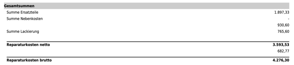 Am Nachmittag hatte ich dann auch gleich einen Termin bei meinem Vertragshändler bekommen, um ein Gutachten über den Schaden zu machen, der dann bei der Versicherung eingereicht wurde. Der Schaden wurde am Freitag dann von der Versicherung zur Reparatur freigegeben und mein Auto wird noch vor unserem Urlaub im April in stand gesetzt. Geplant sind dafür eine Woche an Arbeitszeit.