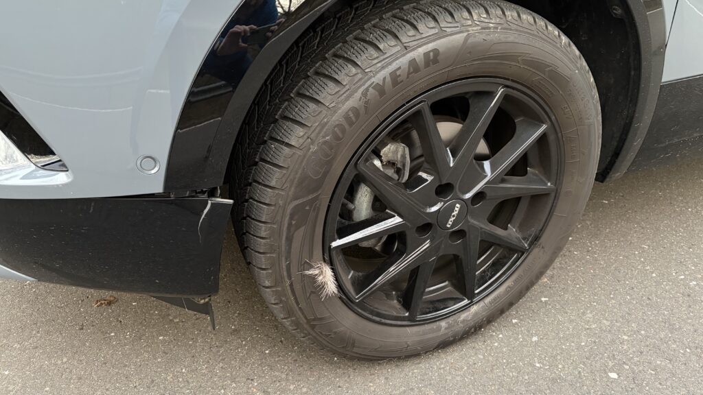 Am Montag befuhr ich die Landstraße zwischen meinem Wohnort und meinem Nachbarort auf dem Weg Richtung Autobahn, Richtung Arbeit. Als mit kurz nach dem Ortsausgangsschild ein Reh von links ins Auto lief. Leider konnte ich das Reh nicht mehr finden und habe dann Beweisfotos (Haare am Reifen und Stoßstange) gemacht, nachdem ich den Unfallort abgesichert hatte. Darauf folgte der Anruf bei der Polizei, um meinen Wildunfall zu melden. Für die Teilkaskoversicherung benötigt man ja eine Wildunfallbescheinigung.